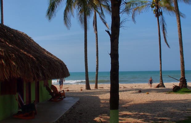 La playa es muy larga y solitaria, con cocotales que en algunos casos se han convertido en alojamientos básicos de cabañas y hamacas.